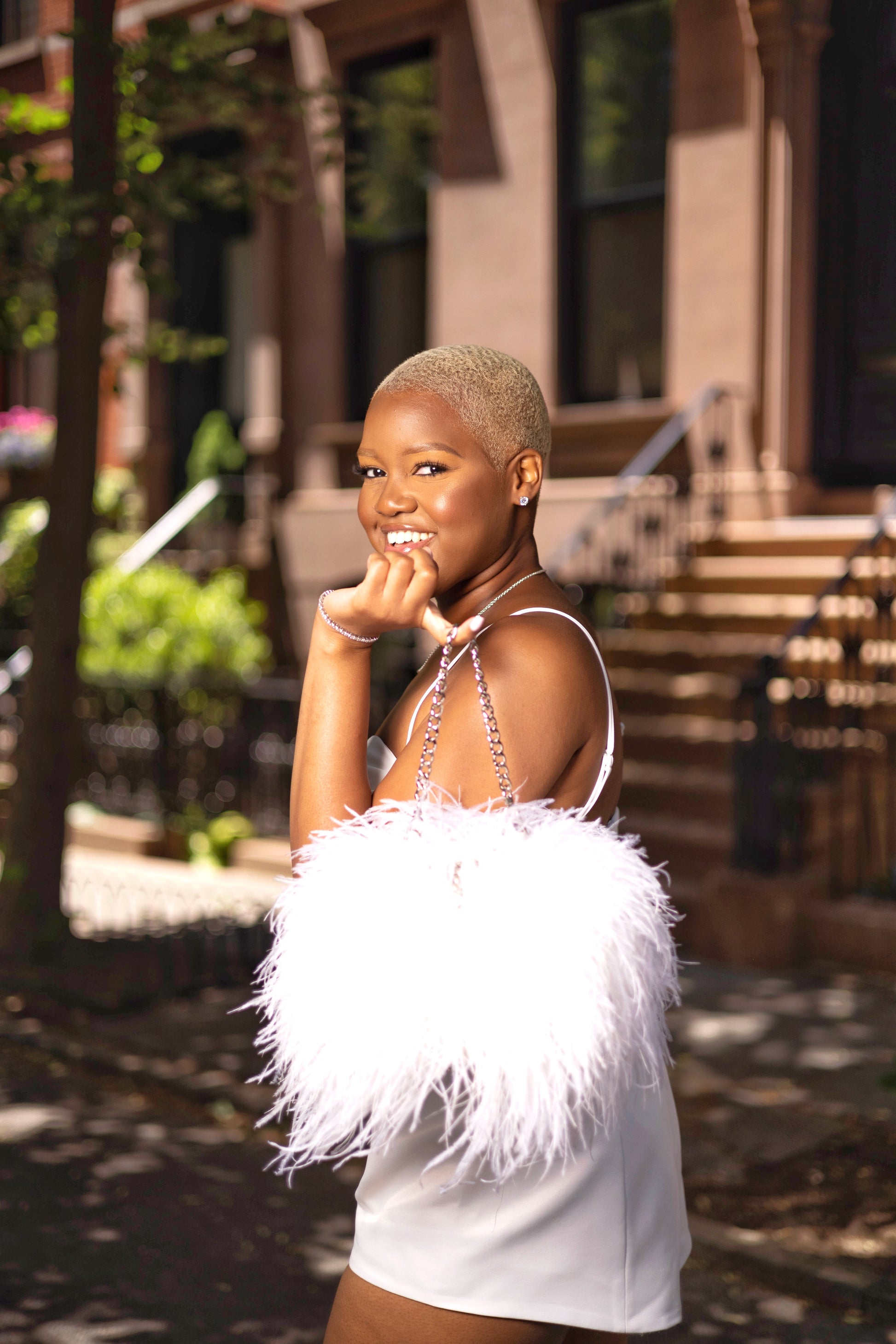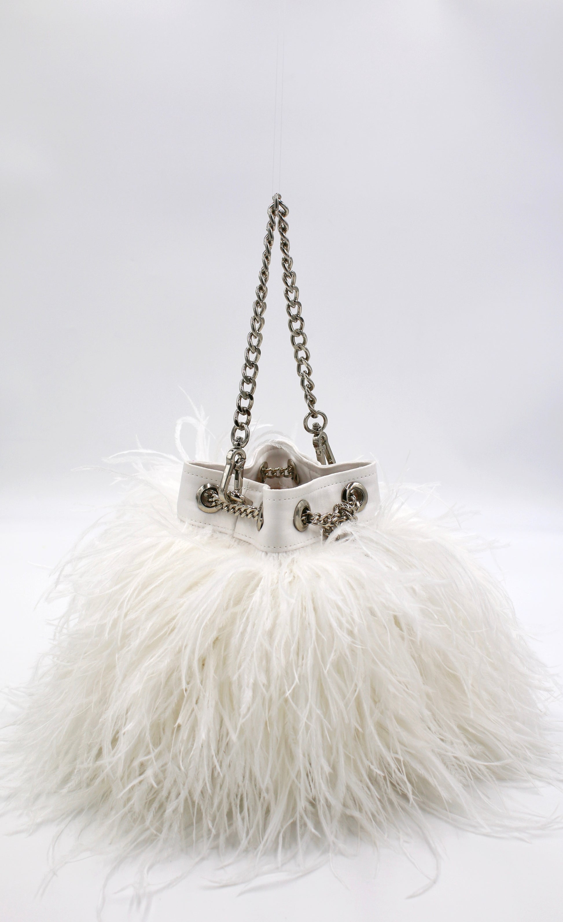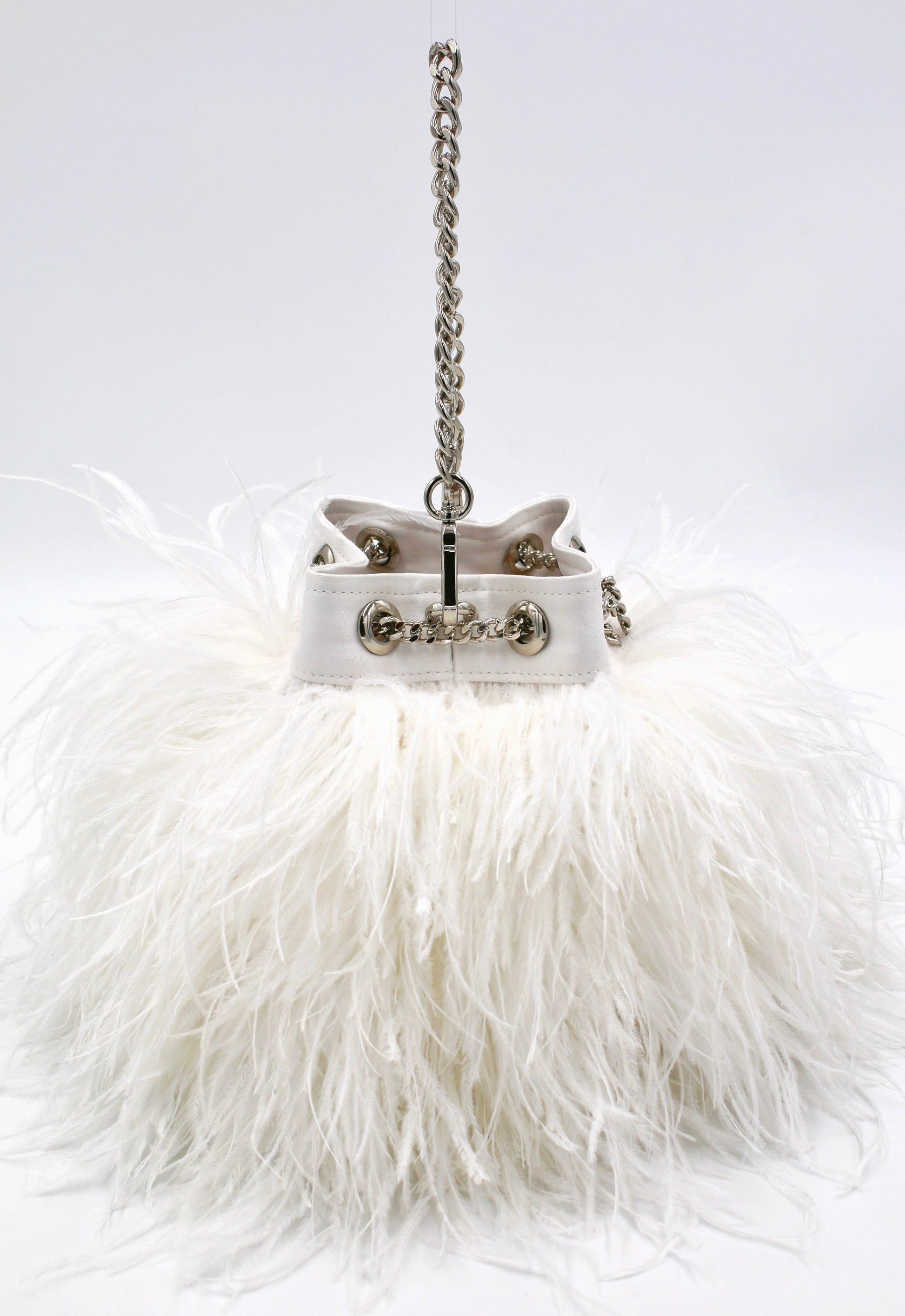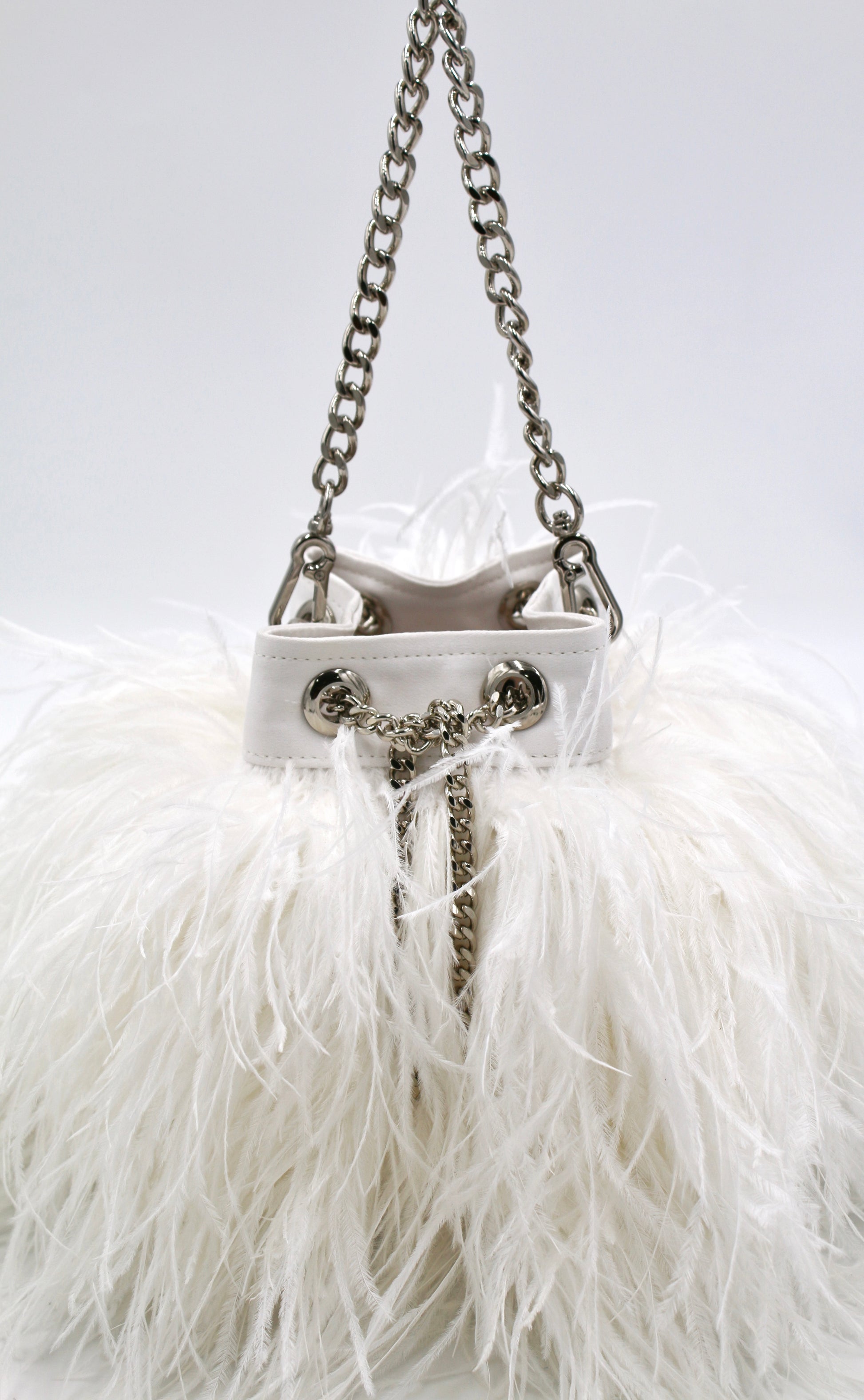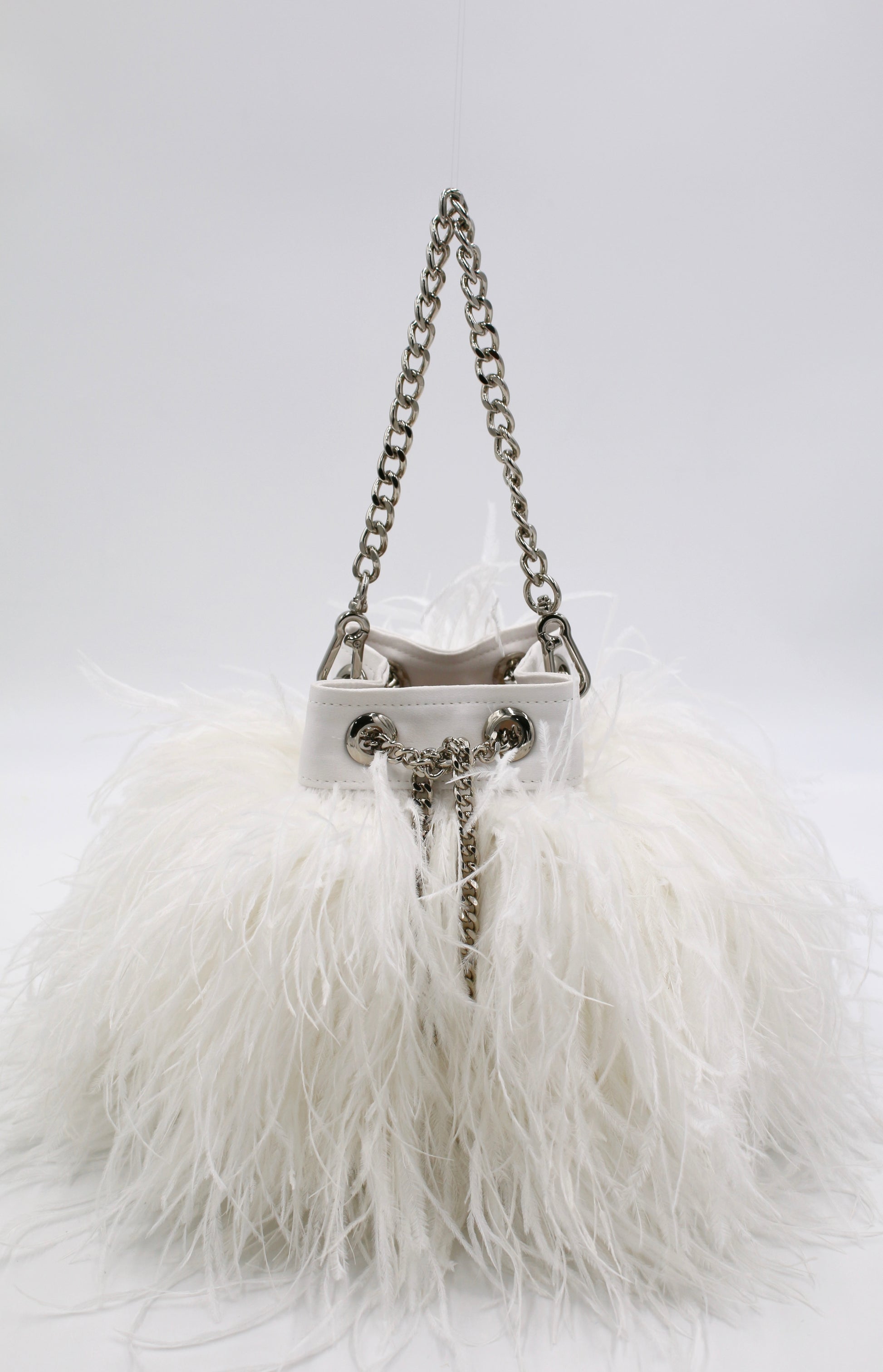The Ostrich Feather Bucket Bag in Pearl is the perfect bag to spice up any look! Featuring white ostrich feathers this handbag adds a sexy, flirty, feminine edge to any look!